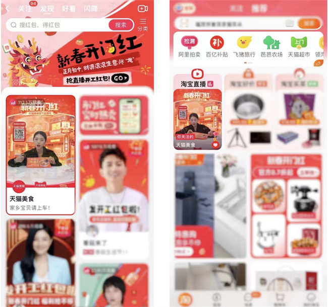 此外,淘寶春節(jié)不打烊期間,淘寶美食行業(yè)持續(xù)助推「家鄉(xiāng)寶貝請上車」話題直播,用戶在手機(jī)端應(yīng)用首頁可以直通#家鄉(xiāng)寶貝請上車#直播間,為活動(dòng)持續(xù)引流。