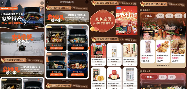 在站內(nèi),淘寶聯(lián)動(dòng)淘寶美食行業(yè)、天貓汽車行業(yè)、阿里數(shù)字鄉(xiāng)村等作為協(xié)同方,3輛車企品牌(吉利、奇瑞、星途)愛心提供車輛支持平面及視頻拍攝,超150家農(nóng)產(chǎn)品牌入駐公益會(huì)場,用戶不僅可以購買到物美價(jià)廉的特色家鄉(xiāng)農(nóng)產(chǎn)品,一鍵下單公益寶貝支持公益,還可以通過助力打call的簡易互動(dòng)為家鄉(xiāng)累積人氣。