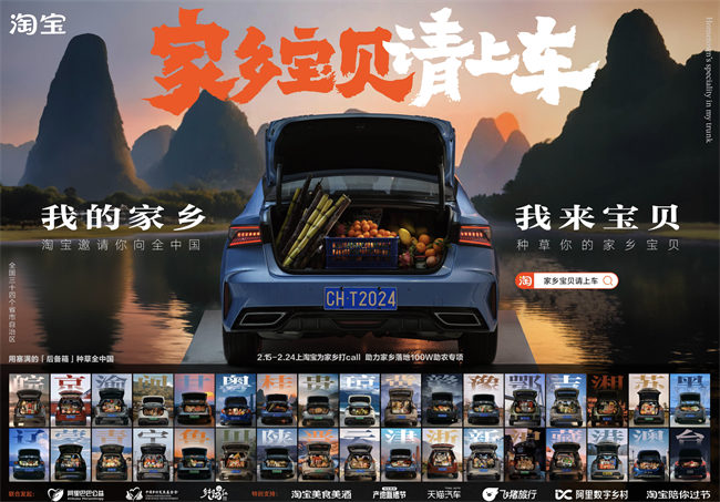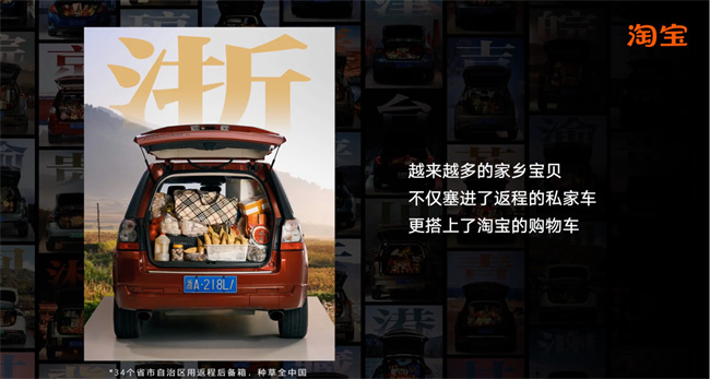2月15日,淘寶官方發(fā)布一支「家鄉(xiāng)寶貝請上車」品牌公益片,聯(lián)合阿里巴巴公益、中國鄉(xiāng)村發(fā)展基金會(huì)以及國家文旅部的鄉(xiāng)村網(wǎng)紅辦,正式官宣公益活動(dòng)開啟。短片中,一個(gè)個(gè)后備箱被各地的特產(chǎn)填滿,雖然后備箱的空間有限,但承載了家人無限的愛和囑托。