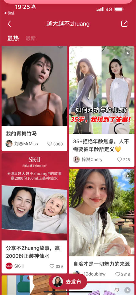 對當下的真實洞察,正是SK-II始終能贏得消費者青睞的原因。在小紅書上,SK-II 聚焦“脫美役”這一現(xiàn)象,發(fā)起 #越大越不Zhuang # 話題,鼓勵用戶分享自己的故事,通過更多真實、鮮活的案例,為女性的活法給出參考答案。
