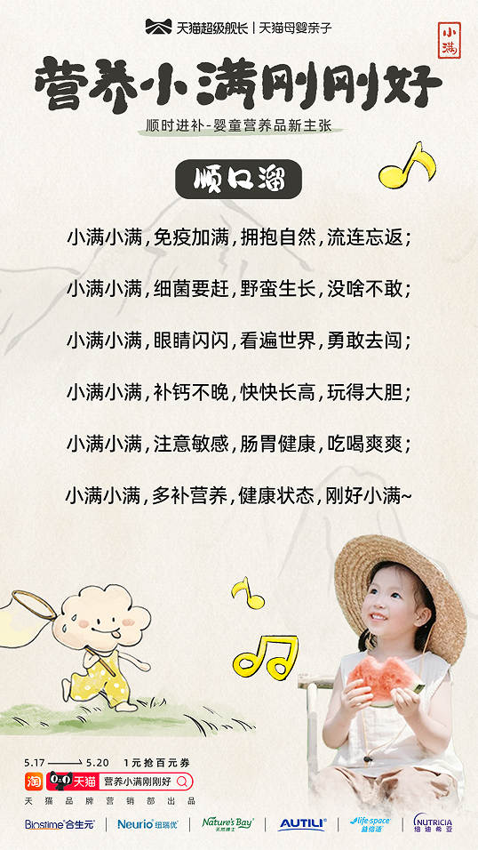 “營養(yǎng)小滿剛剛好”摒棄賣點式說教,與6大嬰童營養(yǎng)品牌:合生元、紐瑞優(yōu)、天然博士、澳特力、lifespace(益倍適)、紐康特,用“寶寶營養(yǎng)版”小滿節(jié)氣順口溜集中發(fā)力,傳遞“順時進補”全新嬰童營養(yǎng)新主張,潛移默化培養(yǎng)家長細分寶寶不同成長期營養(yǎng)需求,分時分階、精準補充營養(yǎng)的認知,讓寶寶達到健康小滿狀態(tài)。補足成長關(guān)鍵期的細分營養(yǎng)短板。