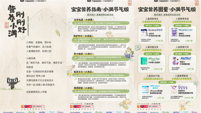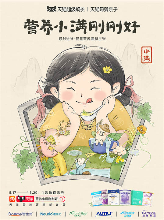 隨著年輕人對傳統(tǒng)文化的認同和歸屬愈發(fā)強烈,對時令養(yǎng)生也日漸關(guān)注?!靶M到,苦夏始,需補給”,天貓母嬰親子洞察這一用戶心理特征,在今年小滿之際,提出#營養(yǎng)小滿剛剛好#順時進補的營養(yǎng)補充概念?!靶M小滿,多補營養(yǎng),健康狀態(tài),剛好小滿!”用一首火出圈的小滿版寶寶順口溜,唱出營養(yǎng)順時進補的小滿巧思。