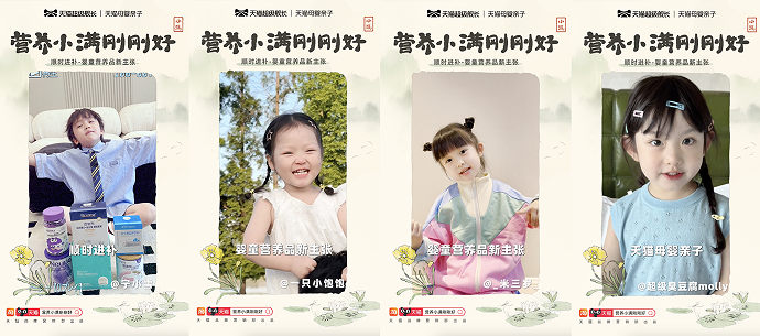 天貓母嬰親子以趣味順口溜萌娃演繹的形式,“一語雙關(guān)”地將營銷主題巧妙融于其中,借勢小滿,上線“營養(yǎng)小滿剛剛好”的嬰童營養(yǎng)品營銷活動。結(jié)合本土?xí)r令文化衍生出“順時進補”的新中式喂養(yǎng)理念,引起家長的文化認同和情感共鳴。以小滿布局,強塑精準補充營養(yǎng)的育兒意識。