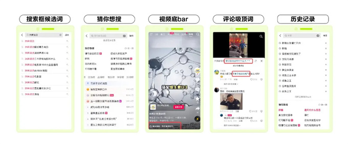 抖音搜索則進(jìn)一步降低了搜索門檻,在種草內(nèi)容中不需要憑空輸入關(guān)鍵詞,一個(gè)種草內(nèi)容可以關(guān)聯(lián)到的引導(dǎo)搜索形式有:搜索框候選詞、猜你想搜、底部視頻bar、評(píng)論吸頂詞,通過(guò)這些多元化的搜索觸點(diǎn),用戶只需要點(diǎn)擊,即刻進(jìn)入搜索頁(yè),獲得種草內(nèi)容的進(jìn)一步信息延展。