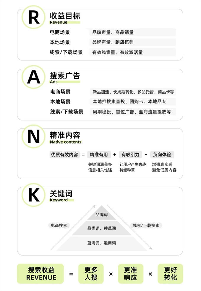 搜索營(yíng)銷的原理沒(méi)有變,仍然遵循RANK四個(gè)詞,其中關(guān)鍵詞與內(nèi)容還是難點(diǎn)與挑戰(zhàn),抖音搜索的升級(jí)在于打通整合了種草到搜索的路徑,通過(guò)自動(dòng)化精準(zhǔn)選詞、AIGC輔助精準(zhǔn)素材生產(chǎn)的能力,極大降低了用戶做好搜索的門檻。而這種整合與打通,帶來(lái)的全新的搜索營(yíng)銷邏輯。