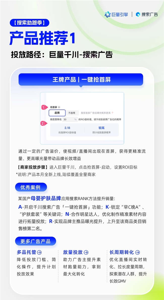 當(dāng)商家精準(zhǔn)把握搜索場(chǎng)域內(nèi)目標(biāo)人群的行為數(shù)據(jù)時(shí),才有可能探索到更具跑量潛力的生意空間,獲得更多精準(zhǔn)的搜索意圖,驅(qū)動(dòng)生意持續(xù)增長(zhǎng)。對(duì)此,巨量引擎搜索廣告聚焦不同經(jīng)營(yíng)場(chǎng)景,上線了更精細(xì)化、更便捷化的搶量、跑量產(chǎn)品,幫助不同經(jīng)營(yíng)場(chǎng)景商家通過(guò)搜索實(shí)現(xiàn)精準(zhǔn)攔截、深度種草、高效轉(zhuǎn)化。