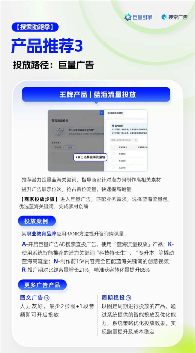 為此,在降低商家素材成本方面巨量搜索推出了「圖文廣告」產(chǎn)品;在探索藍(lán)海關(guān)鍵詞,拓寬商家跑量空間方面推出「藍(lán)海流量投放」產(chǎn)品;在穩(wěn)定投放成本,讓商家實(shí)現(xiàn)更穩(wěn)成本、更高跑量、更高操作效率方面,推出「搜索周期穩(wěn)投」產(chǎn)品。在日常經(jīng)營(yíng)和節(jié)點(diǎn)大促時(shí),商家可綜合利用這三款產(chǎn)品,實(shí)現(xiàn)降本增效,持續(xù)驅(qū)動(dòng)生意獲得長(zhǎng)效增長(zhǎng)。