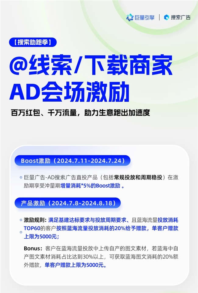 活動(dòng)前30天搜索直投為0的新客,活動(dòng)前30天投過(guò)搜索直投的老客,活動(dòng)期間均可享受Boost激勵(lì)+消返紅包
