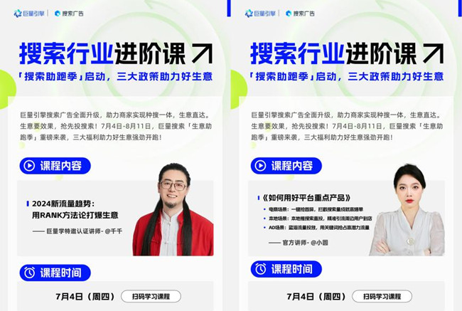 有激勵(lì)、有產(chǎn)品,更要有方法,才能更好的發(fā)揮出巨量搜索的經(jīng)營(yíng)優(yōu)勢(shì)。巨量搜索通過(guò)梳理搜索生意路徑,聚焦商家落地實(shí)操,整合RANK方法,開(kāi)發(fā)出行業(yè)進(jìn)階課程。并將于【搜索助跑季】期間正式推出。