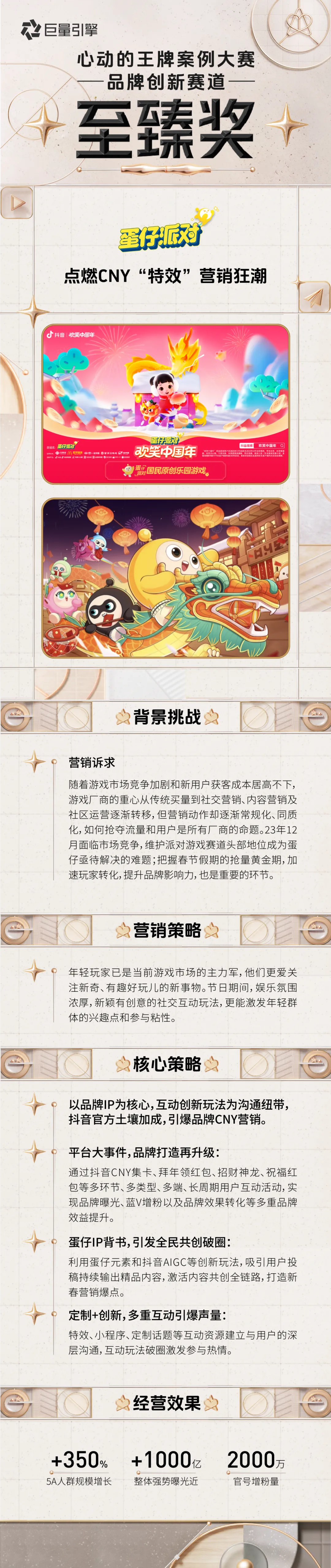 憑借多樣的創(chuàng)新玩法組合,「蛋仔派對(duì)」在CNY營銷中實(shí)現(xiàn)了5A人群規(guī)模增長超350%,整體曝光超1000億次,官號(hào)增粉近2000萬。