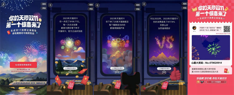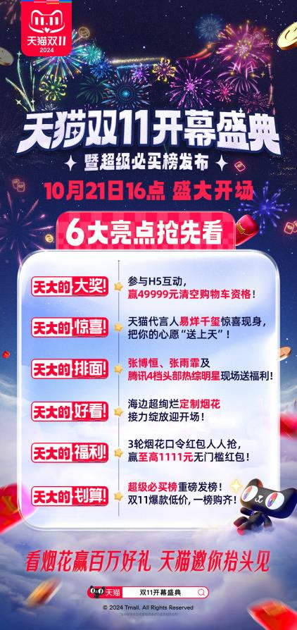 據(jù)悉天貓代言人易烊千璽將親自參加點火儀式為煙花秀啟幕,奧運選手張博恒也將會在現(xiàn)場親手給大家制作煙花相關(guān)的周邊。不僅如此,在放煙花的過程中,天貓還將發(fā)放天大的福利,通過3輪煙花口令紅包的發(fā)放,觀眾將有機(jī)會贏得至高1111元的無門檻紅包。而早在10月17日,站內(nèi)搜索【雙11開幕盛典】將生成專屬報告,除了有機(jī)會贏取開幕盛典的門票,還有機(jī)會贏得清空49999元購物車大獎。