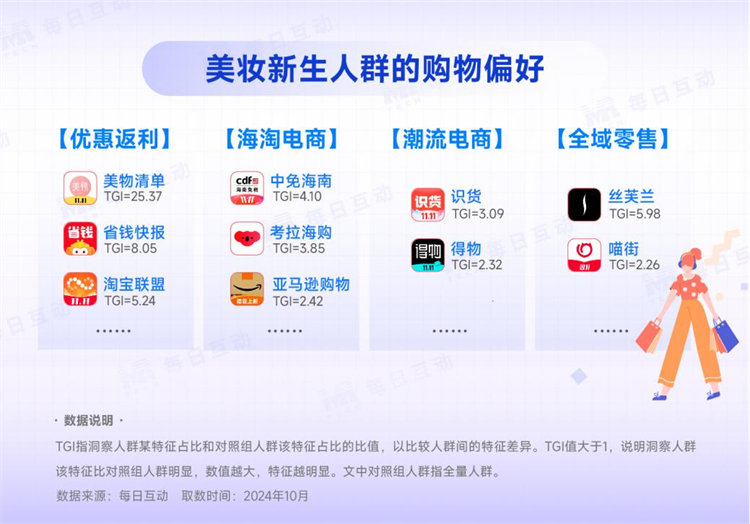 通過(guò)每日互動(dòng)大數(shù)據(jù)觀測(cè),美妝新生們偏好使用優(yōu)惠返利類、海淘類、潮流電商類APP等多樣化的購(gòu)買渠道。同時(shí),美妝新生們還偏好線上與線下均可購(gòu)買的綜合性渠道,例如絲芙蘭、喵街等。