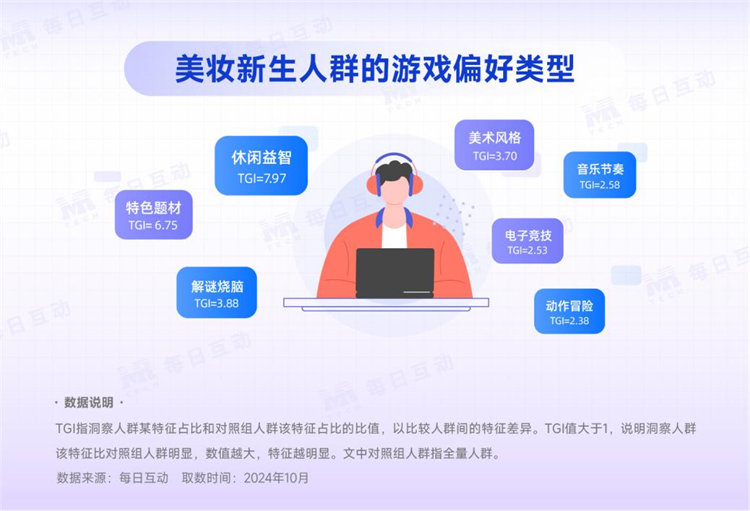 美妝新生們不僅熱衷買買買(購(gòu)物TGI=38.85),Z世代的TA們也熱愛(ài)游戲(TGI=13.09),同時(shí)也不落下教育學(xué)習(xí)(TGI=7.75),這為品牌在觸達(dá)細(xì)分人群方面提供了更多的策略支撐。通過(guò)每日互動(dòng)大數(shù)據(jù)觀測(cè)整理,本文總結(jié)出美妝新生人群的游戲類型偏好和針對(duì)性營(yíng)銷策略建議: