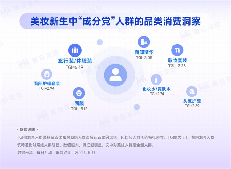 美妝新生中的這些“成分黨”們更偏向“旅行裝/體驗(yàn)裝”類小容量的產(chǎn)品,先試用后購(gòu)買的理性、體驗(yàn)式的消費(fèi)觀念更加顯著。另外,TA們更聚焦美容護(hù)膚品類,尤其是面部護(hù)理和彩妝產(chǎn)品。