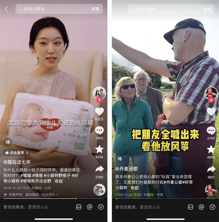 活動期間,#帶娃秋天出去野 話題熱度居高不下,聚合各類創(chuàng)作者持續(xù)輸出“秋日親子出行生活新方式”。其中,劇情博主@婚后這七年 以用戶關(guān)注的婆媳問題為切入點,講述婆婆是婚姻最好的加油站的故事。親子博主@丹麥迷歌 則分享了生活中朋友戶外相聚的溫馨瞬間。@趙肉絲cici、@王豆豆愛逗逗兒 等諸多不同賽道的寶藏創(chuàng)作者也輪番開啟花式分享,巧妙地將好奇小森林去野系列紙尿褲融入其中,將透氣散熱、干爽不粘、柔軟親膚的產(chǎn)品特點展示出來,大大提升了話題的內(nèi)容質(zhì)量以及品牌的熱度,實現(xiàn)對產(chǎn)品的深度種草。