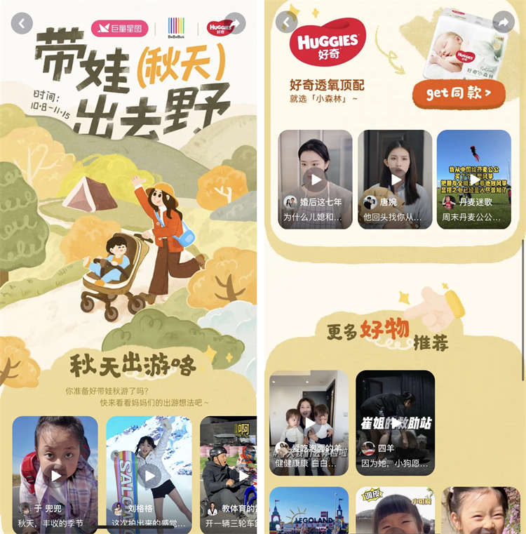 乘著節(jié)點的東風,在內(nèi)容場景下,「帶娃秋天出去野」IP活動吸引了海量創(chuàng)作者創(chuàng)作聚焦秋游、親子生活等爆款內(nèi)容。同時利用熱門話題、H5頁面、多個資源位曝光等方式植入品牌和產(chǎn)品信息,讓好奇品牌和秋日出行場景產(chǎn)生心智關(guān)聯(lián),實現(xiàn)產(chǎn)品的大范圍“種草”。