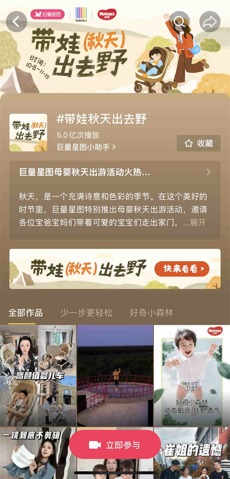 為了幫助更多品牌抓住秋日親子出游的流量風口,引爆聲量熱潮,活動期間,巨量星圖母嬰行業(yè)推出貼合用戶興趣的出游話題#帶娃秋天出去野,以主題投稿+互動玩法吸引眾多創(chuàng)作者持續(xù)輸出優(yōu)質(zhì)種草內(nèi)容,持續(xù)滲透平臺內(nèi)與秋日相關(guān)的核心用戶場景,引領(lǐng)秋日出行新潮流。