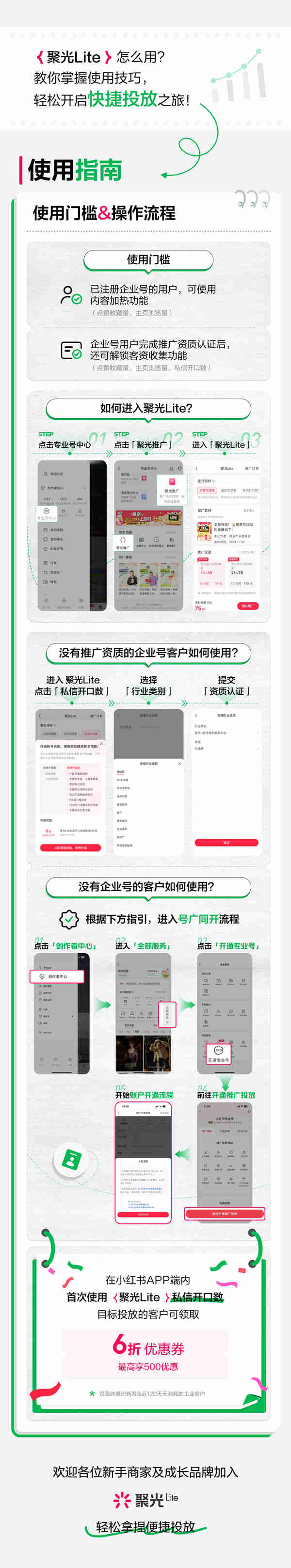 想要了解更詳細(xì)的使用流程及操作步驟,請(qǐng)持續(xù)關(guān)注「小紅書商業(yè)動(dòng)態(tài)」公眾號(hào)及視頻號(hào)發(fā)布內(nèi)容,歡迎各位新手商家及成長(zhǎng)品牌加入聚光Lite,開(kāi)啟你的快捷投放之旅!