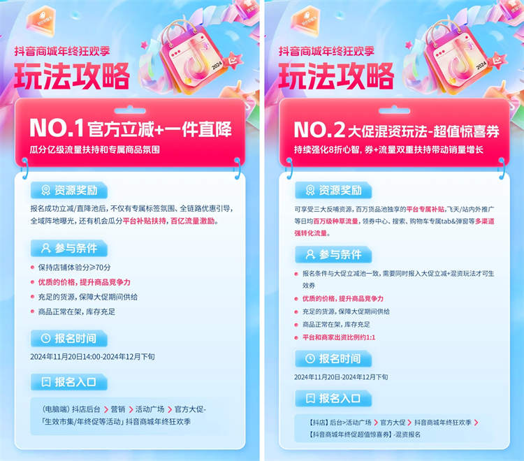 大促混資玩法-超值驚喜券是2024年雙11的新增玩法,將在「抖音商城年終狂歡季」持續(xù)發(fā)力。此玩法由平臺與商家對提報(bào)活動商品進(jìn)行1:1混合出資補(bǔ)貼,平臺額外加碼數(shù)千萬預(yù)算+億級流量扶持,值得想做訂單和GMV爆發(fā)增長的商家重點(diǎn)關(guān)注。成功報(bào)名的商家可享受百萬貨品池獨(dú)享的平臺專屬補(bǔ)貼,日均百萬級種草流量以及多渠道強(qiáng)轉(zhuǎn)化流量等三大反哺資源。