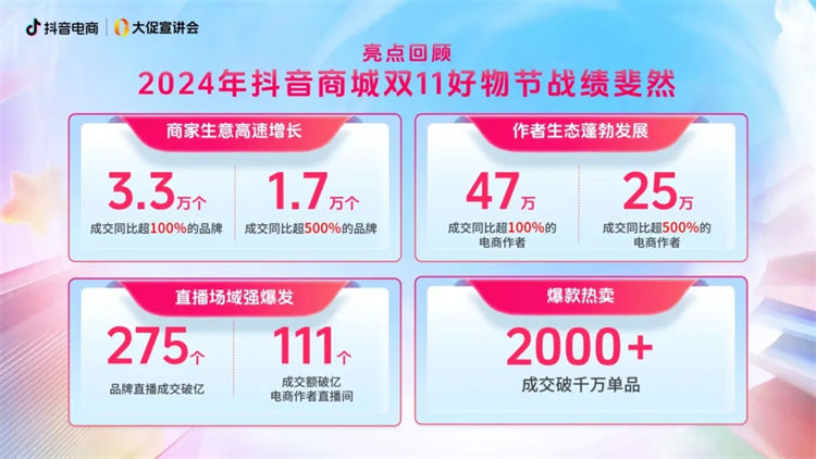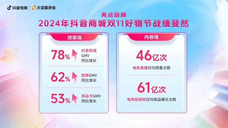 抖音電商活動運(yùn)營總監(jiān)謝湛 首先回顧「抖音商城雙11好物節(jié)」的亮眼“成績單”。相關(guān)數(shù)據(jù)表明,24年雙11期間,抖音商城GMV、搜索GMV、商品卡GMV分別同比增長78%、62%和53%;電商直播日均觀看46億次,電商短視頻日均商品曝光61億次,且各項(xiàng)指標(biāo)都有很好的爆發(fā),這不僅證明了抖音電商的強(qiáng)大競爭力,更為商家們持續(xù)深耕提供了堅(jiān)定的信心支撐。