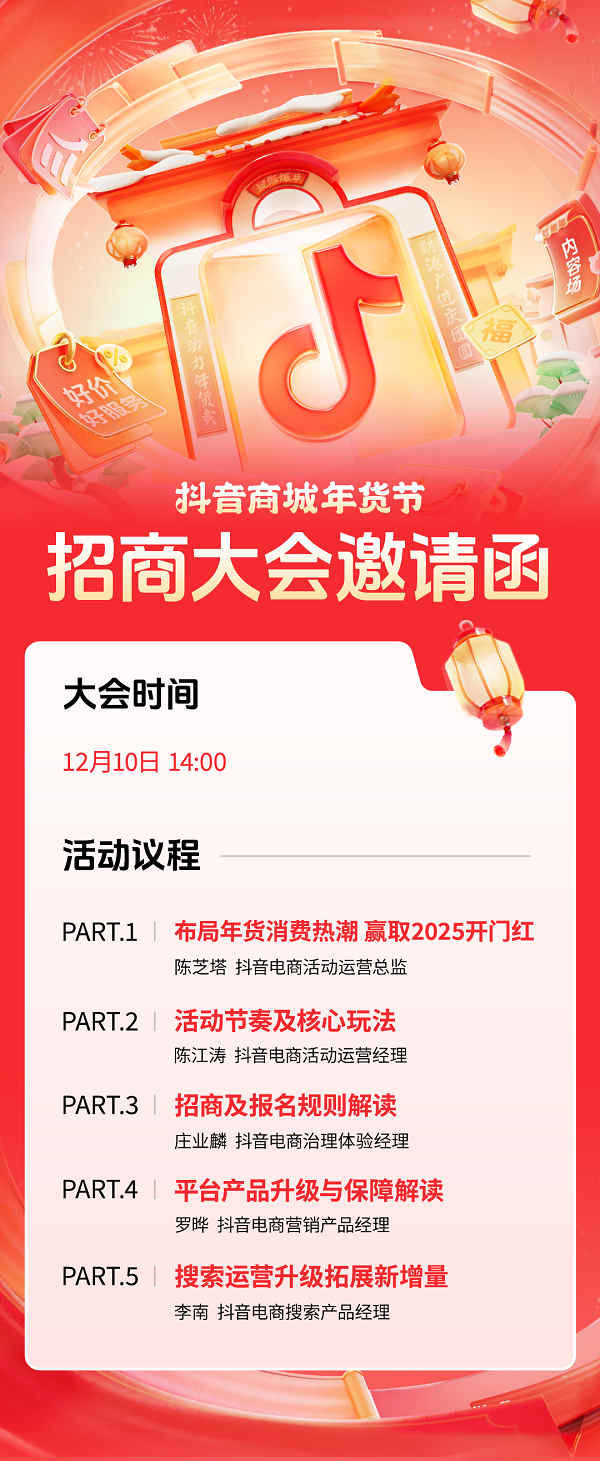 年關將至,年味漸濃,用戶年貨采購需求激增。為幫助商家高效應對消費高峰,搶占生意先機,「抖音商城年貨節(jié)」招商大會將于12月10日正式開啟。大會期間,抖音電商相關業(yè)務負責人深入講解本次大促的活動節(jié)奏、核心玩法、招商及報名規(guī)則、產(chǎn)品升級與保障以及搜索產(chǎn)品升級等干貨內容,助力商家贏得2025生意開門紅!
