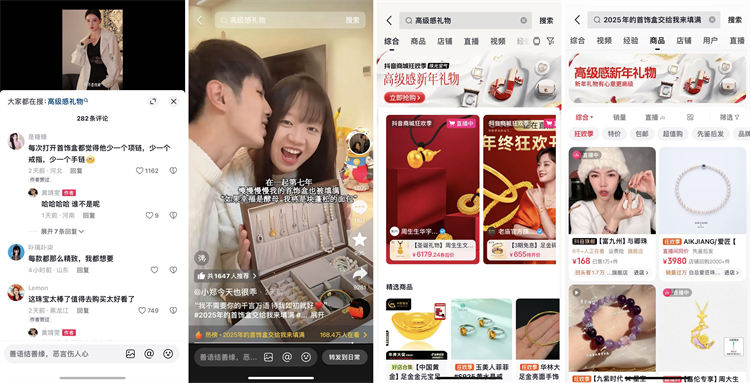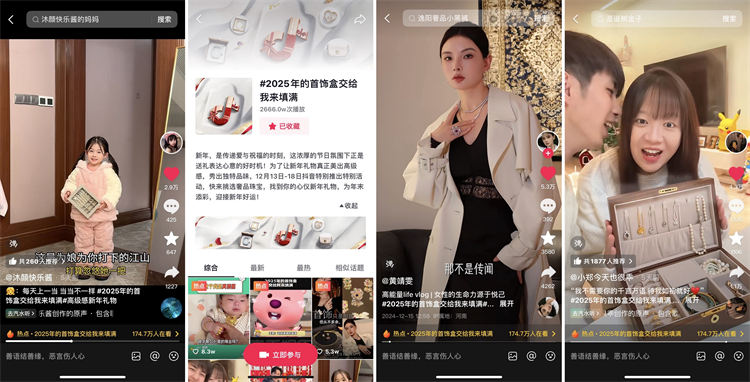 內(nèi)容型直播間熱火朝天,話題內(nèi)容與資源布局緊隨其后?;顒?dòng)期間,抖音商城推出#2025年的首飾盒交給我來(lái)填滿 、#新年氛圍感穿搭被珠光寶氣拿捏了 兩大熱點(diǎn)話題,不僅吸引眾多達(dá)人的內(nèi)容投稿,也引發(fā)了大批珠寶潮奢愛(ài)好者的共鳴與討論。