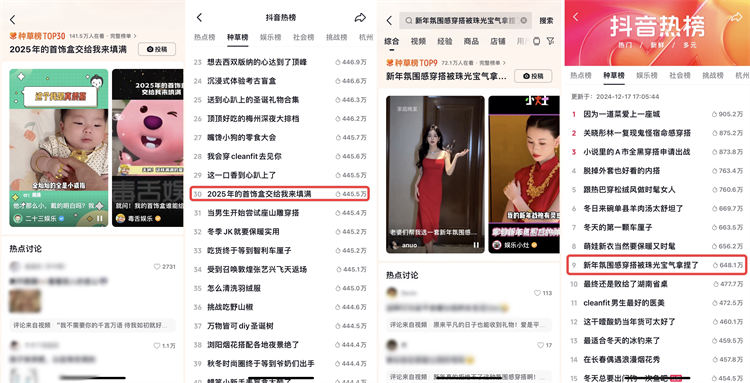 在優(yōu)質(zhì)達(dá)人內(nèi)容的帶動(dòng)下,#2025年的首飾盒交給我來(lái)填滿、#新年氛圍感穿搭被珠光寶氣拿捏了 分別登上抖音種草榜TOP30、抖音種草榜TOP9 ;同時(shí),與話題#高級(jí)感禮物 #高級(jí)感新年禮物 聯(lián)動(dòng) ,多個(gè)話題累計(jì)播放量超1億。話題不僅精準(zhǔn)地捕捉到了消費(fèi)者的心理需求,更借助達(dá)人多樣化的敘事,將珠寶潮奢的價(jià)值與人們的生活場(chǎng)景、情感體驗(yàn)緊密聯(lián)系在一起,成功為“高級(jí)感新年禮物”活動(dòng)導(dǎo)入更精準(zhǔn)的流量。