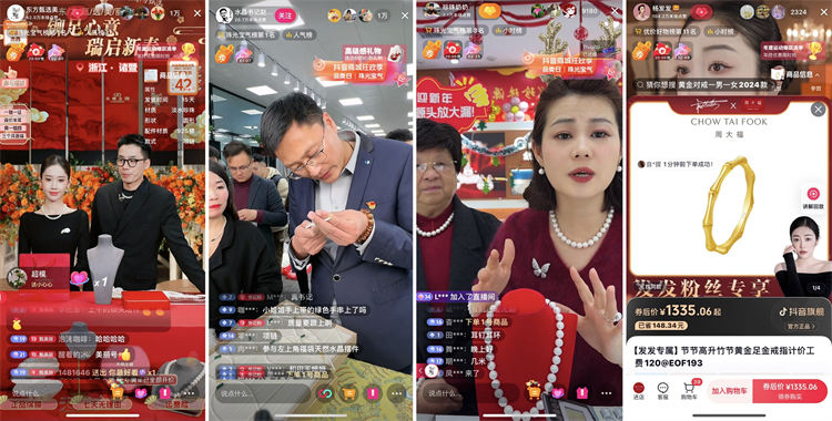 此外,商家們更是在互動(dòng)內(nèi)容方面下足功夫,為直播間增添更多看點(diǎn)和亮點(diǎn)。在@珍珠奶奶的直播間中,主播們身著各式各樣的中式服裝,根據(jù)新中式的特點(diǎn)和風(fēng)格,推薦與之相配的珠寶飾品,如溫潤(rùn)如玉的珍珠項(xiàng)鏈、典雅大方的翡翠戒指、精致細(xì)膩的景泰藍(lán)耳環(huán)等,讓每一件珠寶都與主播的穿搭相得益彰,凸顯產(chǎn)品高質(zhì)感和優(yōu)雅韻味。通過(guò)主播們的穿搭示范和技巧分享,觀眾們能夠直觀地看到珠寶在不同穿搭下的效果,從而更加容易被吸引和打動(dòng)。