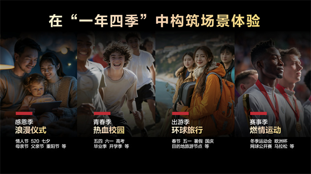鯨鴻動(dòng)能的解法是—— 在一年四季當(dāng)中,把人的情緒體驗(yàn)劃分成不同場(chǎng)景。有溫暖浪漫的“感恩季”、也有青春熱血的“青春季”、還有輕松愉悅的“出游季”和燃情運(yùn)動(dòng)的“賽事季”…… 這期間還疊加了各種電商、車展、公益節(jié)點(diǎn),以及一些小爆點(diǎn)的營(yíng)銷事件。