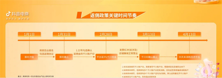 目前報名已于1月1日開啟,持續(xù)至1月31日。其他返傭政策關鍵時間節(jié)奏也已經(jīng)為大家劃好重點了。1月22日勾選確認返傭金的千川賬戶ID;2月28日平臺成功返還3%千川傭金。劃重點,千川ID確認截止時間為3月13日,到4月13日時,商家還未綁定千川賬戶,或未消耗完畢的傭金將視為無效。