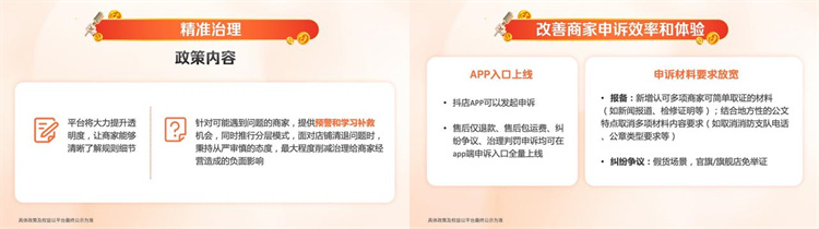 如何全方位提升商家體驗(yàn)?抖音電商以商家需求為服務(wù)導(dǎo)向,推出一系列優(yōu)化舉措,包括提升平臺(tái)規(guī)則透明度、改善商家申訴效率和體驗(yàn)、給遇到問(wèn)題的商家提供預(yù)警和學(xué)習(xí)補(bǔ)救機(jī)會(huì)等。假如遇到糾紛爭(zhēng)議等問(wèn)題,也可通過(guò)抖店APP發(fā)起申訴,得到圓滿解決。同時(shí)抖音電商放寬了申訴材料要求,新增認(rèn)可多項(xiàng)商家可簡(jiǎn)單取證的材料,并且結(jié)合地方性的公文特點(diǎn)取消多項(xiàng)材料內(nèi)容要求,提升取證效率,助力商家早日解決問(wèn)題。