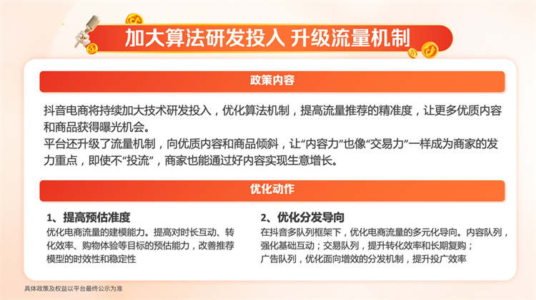未來(lái)抖音電商會(huì)加固技術(shù)“護(hù)城河”,優(yōu)化算法機(jī)制,提高流量推薦精準(zhǔn)度,并且升級(jí)流量機(jī)制。讓那些不做“投流”的商家 ,也能通過(guò)優(yōu)質(zhì)商品、硬核內(nèi)容,贏得流量滾滾來(lái)。