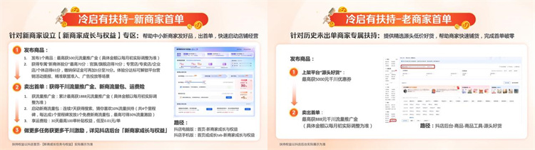 對(duì)于新店冷啟困難的問(wèn)題,抖音電商送上“助攻”。在“新商家成長(zhǎng)與權(quán)益”專(zhuān)區(qū),只要完成發(fā)布新品、賣(mài)出首單等任務(wù),就會(huì)拿到相應(yīng)獎(jiǎng)勵(lì)。比如發(fā)布一個(gè)商品最高獲500元流量推廣金,賣(mài)出首單可獲得千川流量推廣金、新商流量包、運(yùn)費(fèi)險(xiǎn)。未賣(mài)出首單的商家也不用著急,抖音電商提供精選源頭低價(jià)好貨,商家可快速鋪貨,沖刺首單破零。