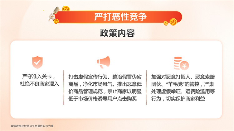 為了優(yōu)化營(yíng)商環(huán)境,抖音電商將嚴(yán)厲打擊惡性競(jìng)爭(zhēng),進(jìn)一步加強(qiáng)平臺(tái)治理,以確保商家利益,確保平臺(tái)生態(tài)平穩(wěn)有序運(yùn)行,具體措施包括嚴(yán)守準(zhǔn)入關(guān)卡、打擊虛假宣傳、整治假冒偽劣商品、嚴(yán)肅處理虛假舉證等,并且加強(qiáng)管控惡意打假人、惡意索賠團(tuán)伙及“羊毛黨”等。同時(shí),對(duì)于惡意低價(jià)商品,抖音電商秉持不姑息原則,禁止商家以明顯低于市場(chǎng)價(jià)格誘導(dǎo)用戶點(diǎn)擊購(gòu)買(mǎi),構(gòu)建良性競(jìng)爭(zhēng)環(huán)境。