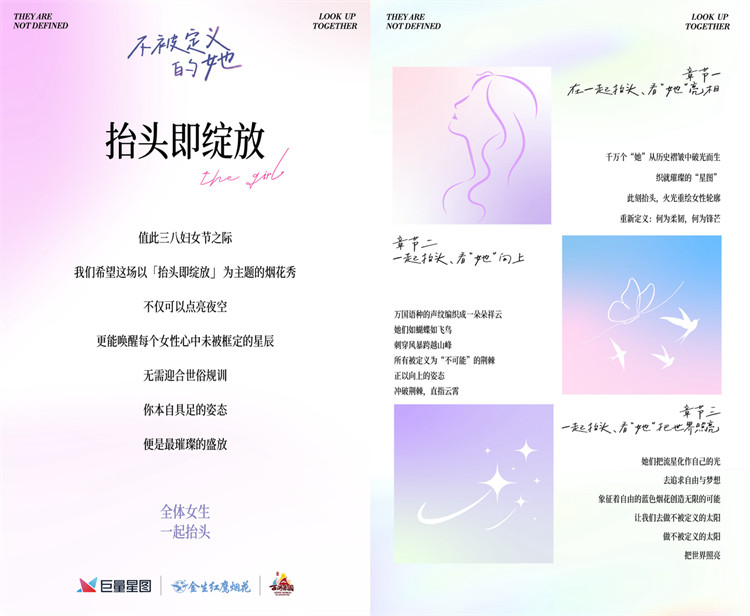 今年三八婦女節(jié)到來之際,巨量星圖發(fā)起“38花火季——不被定義的她”第二季主題活動,攜手江蘇文旅、淮安西游樂園、瀏陽煙花(金生紅鷹)非遺團(tuán)隊(duì),共同邀請全體女生于3月8日前往淮安西游樂園,共赴一場「抬頭即綻放」的主題煙花秀,一日極致浪漫的「花火之夜」樂園游,在抬頭向上間,在打卡紀(jì)念時,讓傳承百年的花火,化作漫天星河,照亮全體女生自信前行的臉龐,喚醒心中未被框定的星辰。