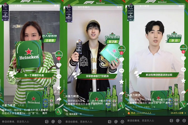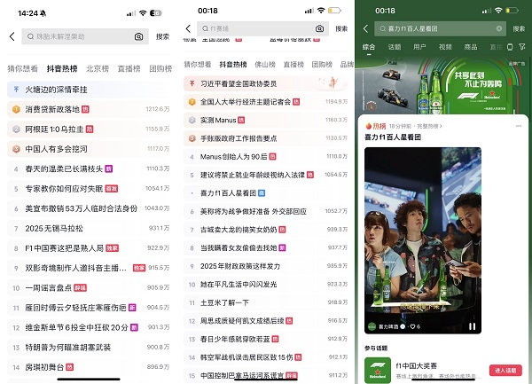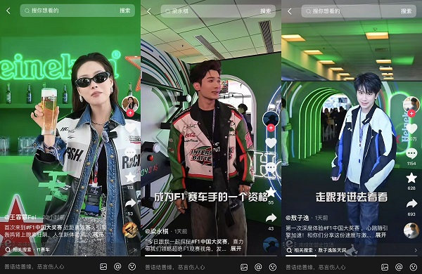 作為冠名贊助商,喜力在賽事倒計時階段以“破圈”為目標,構(gòu)建了從線上話題到線下場景的立體化傳播網(wǎng)。抖音平臺率先發(fā)起#F1中國大獎賽 官方話題,聚合賽事科普、歷史高光瞬間及車迷自發(fā)創(chuàng)作的優(yōu)質(zhì)內(nèi)容,為大眾提供“一站式”觀賽指南。與此同時,品牌專屬話題#喜力F1百人星看團 上線,聯(lián)合胡先煦、李川、楊天真、王霏霏等明星矩陣發(fā)布預熱打call視頻,在擴大活動與品牌影響力的同時,進一步強化 “喜力 = F1觀賽標配” 心智。在明星效應和賽事熱度的雙重加持下,多個相關(guān)話題熱度持續(xù)飆升: #F1中國賽這把是熟人局 強勢沖上抖音熱榜TOP8;#喜力f1百人星看團 空降熱榜榜單,大曝光資源吸引全網(wǎng)目光,助力品牌大事件以社交化傳播實現(xiàn)破圈效應。