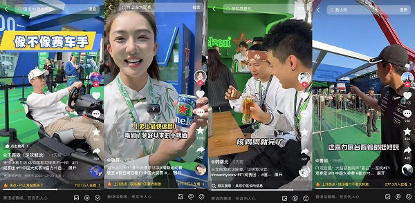 此外,在F1大賽現(xiàn)場,喜力打造的線下展位成為車迷必打卡的 “第三賽道”:啤酒品鑒區(qū)提供喜力產(chǎn)品試飲,賽車模擬器區(qū)還原國際賽車場彎道, 這一“體驗 + 社交”的空間設(shè)計,吸引了現(xiàn)場眾多車迷的駐足。而抖音體育邀約的10 位頭部達人@毒角 SHOW、@鐵豆、@王小羽、@楊政 SG 等,以 “體驗官” 身份打卡喜力展位。他們一邊體驗賽車模擬器挑戰(zhàn),一邊手持喜力啤酒與觀眾分享當下感受,自然傳遞了“觀賽喝喜力”的產(chǎn)品場景。視頻中,無論是在起始橋還是賽道,喜力巨型logo全程高頻露出,凸顯喜力冠名贊助商身份,讓品牌以“沉浸式陪伴者”而非“廣告植入者”的姿態(tài)深入人心。