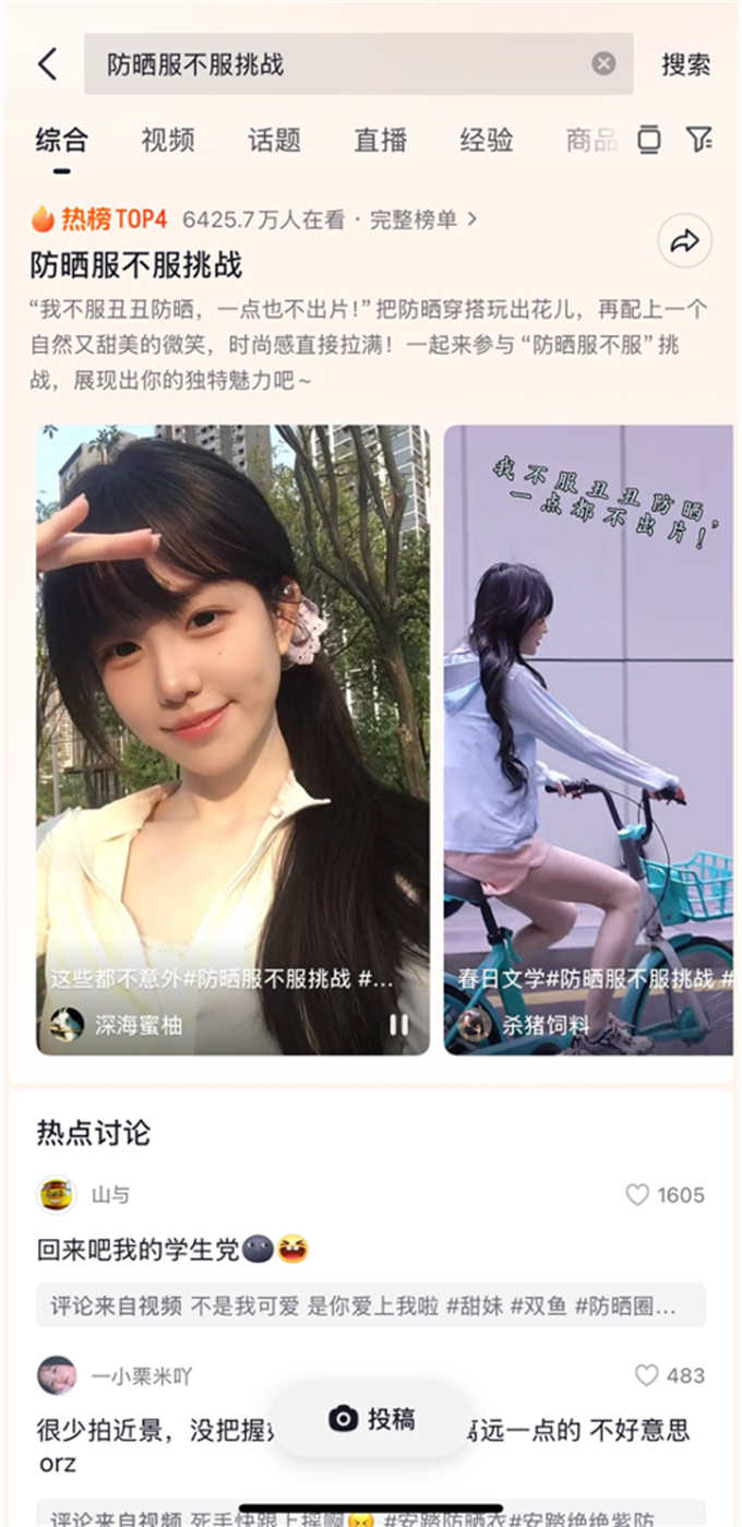 聚焦防曬穿搭、臉部防曬、兒童防曬細分需求,活動以#2025首屆臉基尼大賽等、#防曬圈也來爆改穿搭了、#兒童防曬裝備也太全面了、#防曬服不服 4大互動話題吸引用戶投稿互動,形成“全民曬出硬核裝備”氛圍。