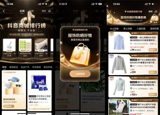 在商城側(cè),抖音商城為品牌設(shè)置超值購、UG發(fā)券等資源,吸引“精打細算”的用戶下單防曬好物;打造“防曬運動戶外好物趨勢金榜”,為用戶提供春日防曬選購指南喚醒用戶消費興趣,推動商家收獲生意增長勢能。