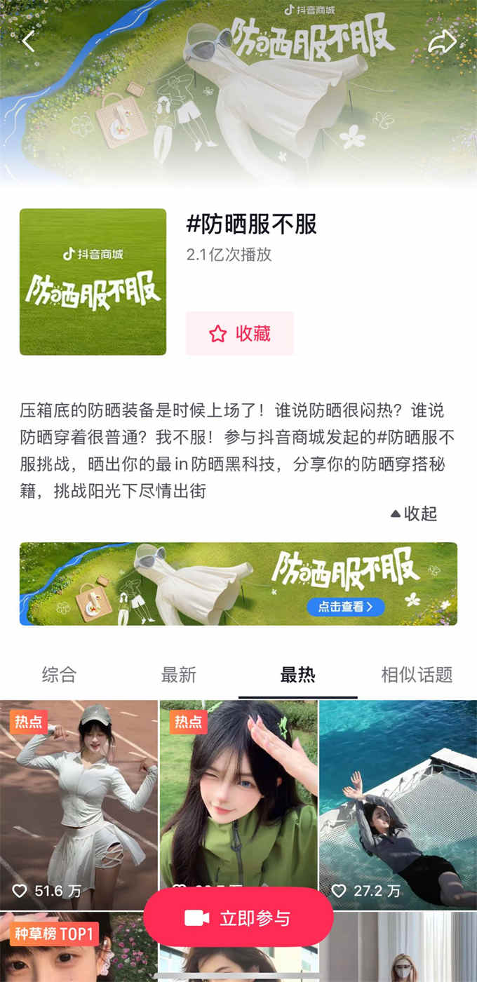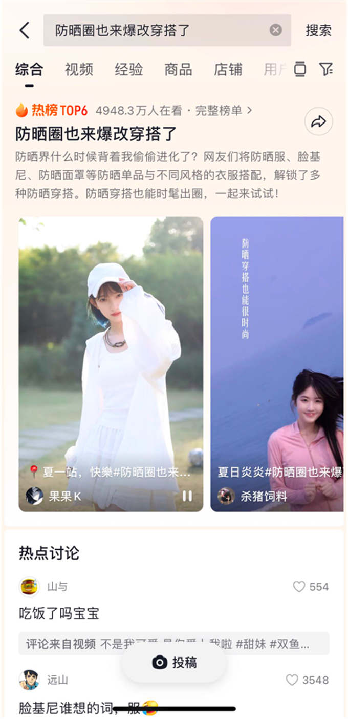 貼近消費者生活場景的好內(nèi)容,往往能觸動用戶的分享熱情,令用戶在互動中加深對產(chǎn)品、品牌的興趣。平臺為助力商家擴大影響力,通過系列熱點的挖掘,引發(fā)明星達人、商家到用戶的投稿,全民參與提升防曬好物內(nèi)容影響力,形成濃烈戶外防曬氛圍。