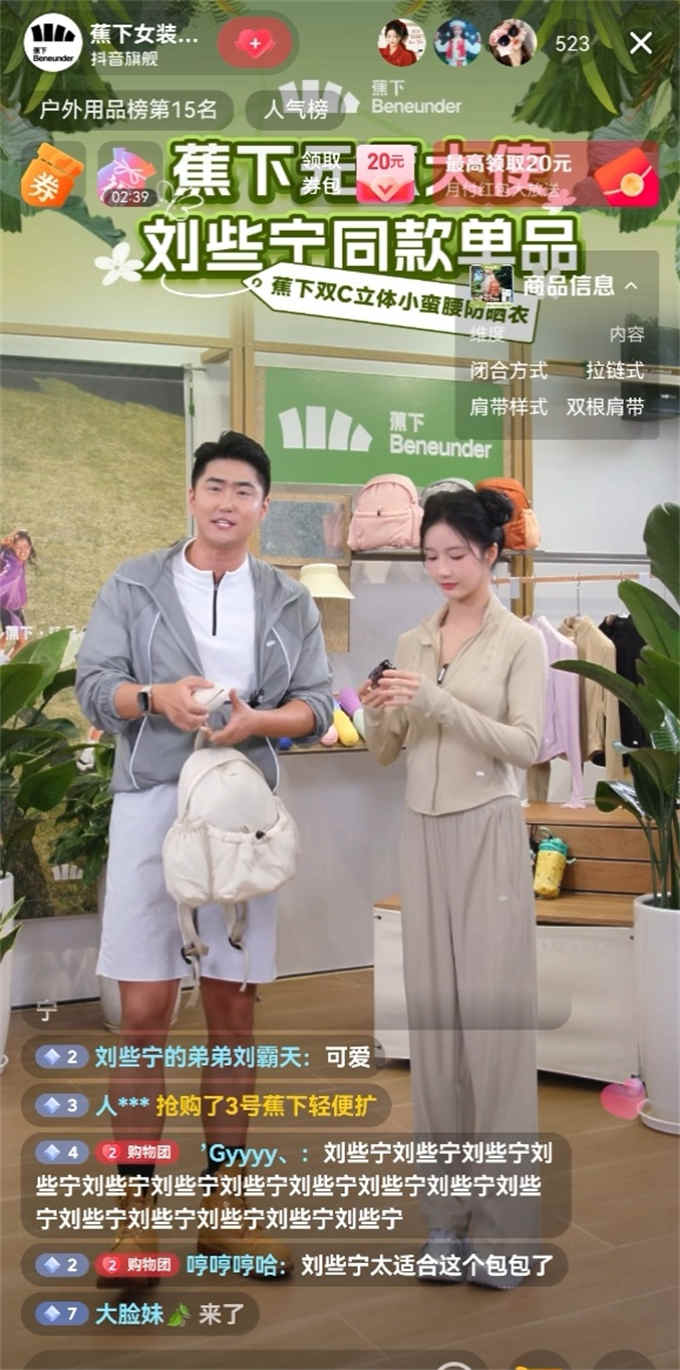 ● 構(gòu)建戶外特色直播場景,打造沉浸式選購體驗。在本次活動中,安踏在官方旗艦店進行專場店播,特別搭建創(chuàng)意戶外場景,以科技感裝備升級直播間視覺,吸引用戶關(guān)注。lululemon打造高爾夫球場戶外練習(xí)直播間,直觀呈現(xiàn)“高爾夫穿搭”,滿足用戶專業(yè)運動需求;蕉下則以戶外露營直播為亮點,通過打造更有氛圍感的直播好內(nèi)容,促進用戶為心動買單,活動期間蕉下官方旗艦店直播間(一場直播)GMV環(huán)比(前1周日均)增長350%