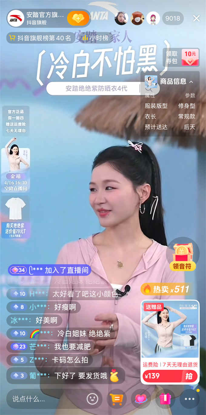當(dāng)下,消費者的個性化需求越發(fā)明顯,決策路徑呈現(xiàn)多元化趨勢,倒逼品牌以差異化內(nèi)容搶占用戶心智。活動期間,平臺為安踏、蕉下、小野和子、lululemon等防曬的先鋒大牌、品類領(lǐng)航員商家提供多種營銷資源,助力商家升級店播內(nèi)容,以差異化的內(nèi)容打造生意增長新引擎。