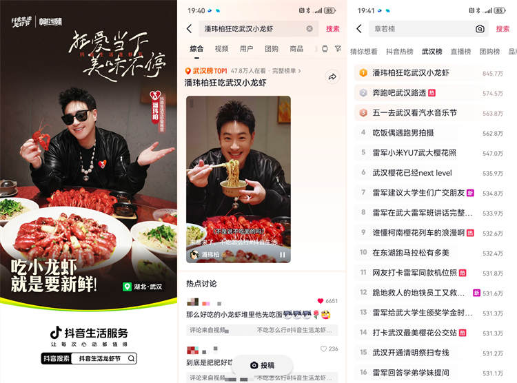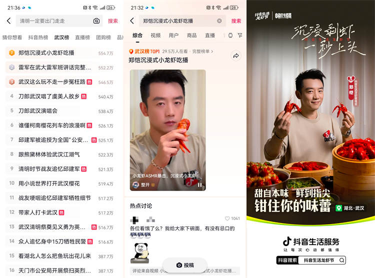 來(lái)武漢錄綜藝期間,鄭凱也不忘去撮一頓小龍蝦。在抖音,鄭愷則分享了他的“沉浸試吃蝦vlog”,以ASMR的形式,讓網(wǎng)友“聽(tīng)見(jiàn)美味”。視頻一經(jīng)發(fā)出,相關(guān)話題#鄭愷沉浸式小龍蝦吃播 沖上全國(guó)熱榜TOP2,播放量超480萬(wàn)次。武漢文旅等賬號(hào)接續(xù)視頻二創(chuàng),掀起一股打卡吃蝦熱。