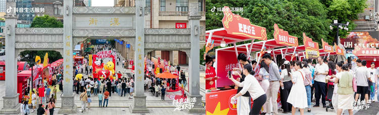 奶龍,是時(shí)下在年輕人中最流行的時(shí)尚IP之一。通過(guò)與這一卡通形象聯(lián)動(dòng),「抖音生活龍蝦節(jié)」既滿足了年輕消費(fèi)群體的打卡需求,也讓線上吃蝦多了一重快樂(lè)。不少武漢本地品牌通過(guò)小龍蝦免費(fèi)試吃、關(guān)注商家抖音號(hào)的用戶現(xiàn)場(chǎng)抽獎(jiǎng)、模特互動(dòng)打卡等方式參與到這場(chǎng)線下市集中,在萌力Buff的加持下收獲更多粉絲。免費(fèi)試吃攤位前,慕名而來(lái)的粉絲嗦完最后一只蝦,抹著嘴角的醬汁感嘆:“這龍蝦香得連殼都想吞!”活動(dòng)相關(guān)短視頻打卡量近萬(wàn)條。