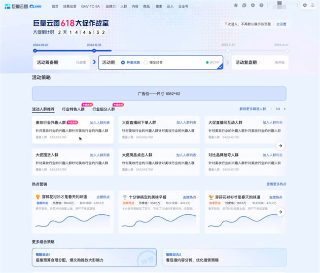 今年618,巨量云圖平臺為品牌提供大促作戰(zhàn)室,幫助品牌實時洞察生意狀況,在活動籌備期、生意轉(zhuǎn)化期、復(fù)盤期的不同階段,提供更具針對性的診斷體系,并圍繞人群、商品、內(nèi)容、直播間等提供針對性的策略,讓大促工作更簡單,也可追蹤。