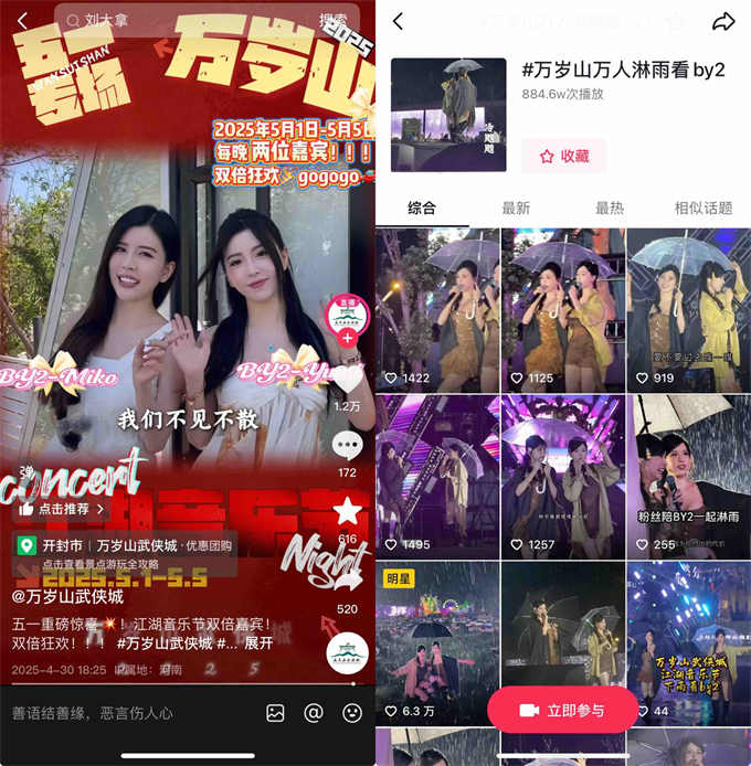 以抖音生活服務(wù)為傳播陣地,通過組建立體化傳播矩陣,讓萬歲山武俠城對游客的用心、上心廣為人知,頻頻出圈。以官方賬號為領(lǐng),經(jīng)典項(xiàng)目的高光瞬間、江湖音樂節(jié)的演出盛況等優(yōu)質(zhì)內(nèi)容一經(jīng)發(fā)布,便迅速引發(fā)用戶圍觀熱議。景區(qū)演員、員工、達(dá)人相輔相成,以第一視角游覽萬歲山武俠城,讓細(xì)節(jié)更動人心,進(jìn)一步助推萬歲山武俠城的破圈傳播。借助抖音生活服務(wù)的內(nèi)容傳播能力,萬歲山武俠城曝光聲量持續(xù)擴(kuò)大,打破地域區(qū)隔,吸引各地人群組團(tuán)打卡。五一期間,其線上團(tuán)購銷量占比達(dá)45%,抖音開封榜前三席位均被景區(qū)相關(guān)話題占據(jù),其中#萬歲山萬人淋雨看BY2 話題更強(qiáng)勢登上全國熱榜。