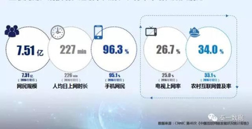中國網(wǎng)民規(guī)模在2017年已達7.5億,增長已經(jīng)趨緩,但農(nóng)村互聯(lián)網(wǎng)普及率只有34%,還有很大的增長空間。同時電視網(wǎng)絡(luò)化趨勢增強,目前的電視上網(wǎng)率已達26.7 %。大屏、農(nóng)村未來潛力巨大,針對此類用戶需要發(fā)力。