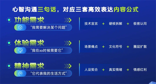 第三步“說對話”,圍繞“功能需求→體驗需求→精神需求”分層匹配溝通邏輯:針對“我需要解決某個問題” 的功能需求,采用“技術宣言+硬核拆解+極客認同”的方式,以專業(yè)視角傳遞產(chǎn)品功能價值;針對“我在某時候需要它”的體驗需求,通過“場景痛點+文化符號+圈層擴散”,結(jié)合具體場景與文化元素引發(fā)圈層共鳴;而針對“它代表我的生活方式”的精神需求,則運用“人設契合+真實情緒+情感紅利” ,借助人設與情緒傳遞品牌精神價值,實現(xiàn)與用戶的深度心智聯(lián)結(jié)。
