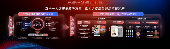 面對(duì)即將到來的京東11.11,京東與騰訊廣告在會(huì)上聯(lián)合發(fā)布11.11大促爆單解決方案,通過雙方數(shù)據(jù)能力,共建“高帶貨指數(shù)達(dá)人庫”實(shí)現(xiàn)高效種草,通過站外合約廣泛觸達(dá)-站內(nèi)搜索再觸達(dá)-站內(nèi)活動(dòng)承接轉(zhuǎn)化的高效引流鏈路助力品牌商家大促實(shí)現(xiàn)高效增長(zhǎng)。