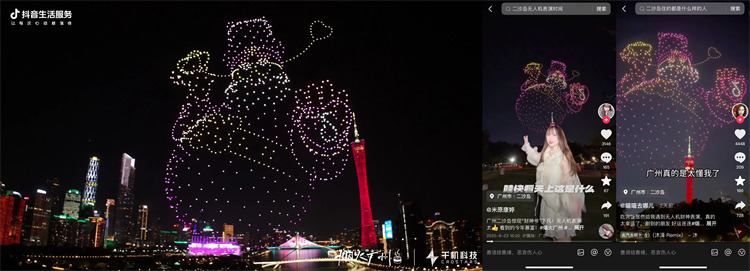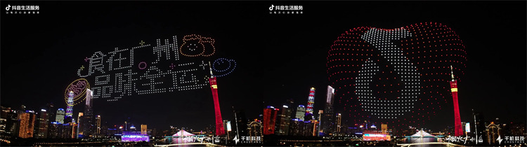 千機(jī)科技的無人機(jī)編隊如靈動精靈,在廣州中軸線上空勾勒出抖音生活服務(wù)「煙火廣州」字樣及廣州特色元素圖案,與周邊流光溢彩的建筑交相輝映??萍寂c城市文化的完美碰撞,瞬間點燃市民和游客的熱情。